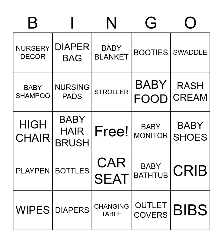 This bingo card has a free space and 24 words: BOTTLES, DIAPERS, STROLLER, WIPES, SWADDLE, NURSERY DECOR, BABY SHAMPOO, DIAPER BAG, BABY MONITOR, CAR SEAT, BABY FOOD, HIGH CHAIR, BABY BATHTUB, CRIB, NURSING PADS, OUTLET COVERS, BABY SHOES, BABY BLANKET, RASH CREAM, BABY HAIR BRUSH, BIBS, PLAYPEN, BOOTIES and CHANGING TABLE.