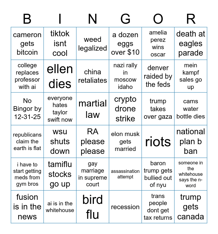 This bingo card has 36 words: assassination attempt, gay marriage in supreme court, recession, college replaces professor with ai, republicans claim the earth is flat, crypto drone strike, ellen dies, bird flu, amelia perez wins oscar, baron trump gets bullied out of nyu, mein kampf sales go up, a dozen eggs over $10, someone in the whitehouse says the n-word, everyone hates taylor swift now, nazi rally in moscow idaho, cameron gets bitcoin, i have to start getting meds from gym bros, trump takes over gaza, No Bingor by 12-31-25, weed legalized, martial law, wsu shuts down, elon musk gets married, RA please please, riots, tiktok isnt cool, denver raided by the feds, ai is in the whitehouse, china retaliates, death at eagles parade, trump gets canada, fusion is in the news, national plan b ban, cams water bottle dies, tamiflu stocks go up and trans people dont get tax returns.