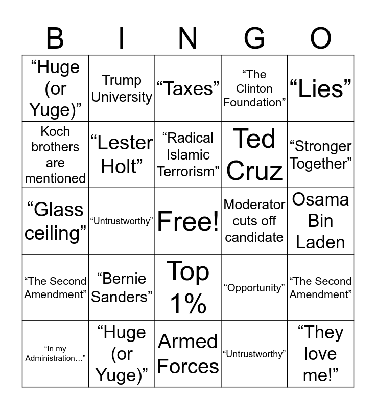This bingo card has a free space and 126 words: “It takes a village”, “Radical Islamic Terrorism”, “The Clinton Foundation”, “We don’t win anymore”, “Physical Stamina”, “The Khan Family”, “The Second Amendment”, “The system is rigged”, “Untrustworthy”, “Bernie Sanders”, “The Trump Foundation”, “Amnesty”, “Emails”, “Temperamentally unsuited”, “Obamacare”, “Bigotry”, “Huge (or Yuge)”, “On my first day...”, “It's gonna be great, believe me”, “Lies”, “Bankrupt Casinos”, “Glass ceiling”, “Build the wall”, “Lies”, “It takes a village”, “Radical Islamic Terrorism”, “The Clinton Foundation”, “We don’t win anymore”, “Physical Stamina”, “The Khan Family”, “The Second Amendment”, “The system is rigged”, “Untrustworthy”, “Bernie Sanders”, “The Trump Foundation”, “Amnesty”, “Emails”, “Temperamentally unsuited”, “Obamacare”, “Bigotry”, “Huge (or Yuge)”, “On my first day...”, “It's gonna be great, believe me”, “Lies”, “Bankrupt Casinos”, “Glass ceiling”, “Build the wall”, “Lies”, “Mexico”, “Working Families”, “When I was Secretary of State”, “Nuclear weapons”, “ISIS/ISIL”, “Iran”, “Illegal Aliens”, “Let me Finish”, “Trans-Pacific Partnership”, “Jobs”, Candidate goes over allotted time, Moderator cuts off candidate, Koch brothers are mentioned, Vladmir Putin, Candidate cracks a joke, “Nation of immigrants”, “God Given Right/Potential”, “Play by the rules”, The Middle Class, Top 1%, Gun Control, Osama Bin Laden, Situation Room, Barack Obama, Bill Clinton, Undocumented, 9/11, Path to Citizenship, Police Brutality, “Ronald Reagan”, Family Values, “Make America Great Again”, “America is Great”, “Melting Pot”, The Patriot Act, China, “In my Administration…”, “Let me be clear…”, “Common sense..”, The Middle Class, Armed Forces, “Opportunity”, “Leader of the Free World”, “Equality”, “Gang of Six”, “Lester Holt”, “Qualified”, “Taxes”, “Wall Street”, “The American People…”, “Mexicans”, “Racists”, “They love me!”, “Rapists and murderers”, “Opportunity”, “VOTE”, Iraq, Afghanistan, Affordable Health Care, Job Security, “Stronger Together”, Tim Kaine, “Go to my website…”, “First Lady”, “NAFTA”, Benghazi, Saudi Arabia, NYTimes Endorsement, Candidate sips water, Trump adjusts tie, Israel, “I’ll never forget…”, Ted Cruz, Tax Returns, Medical Records, Small Businesses, Trump University and Supreme Court.