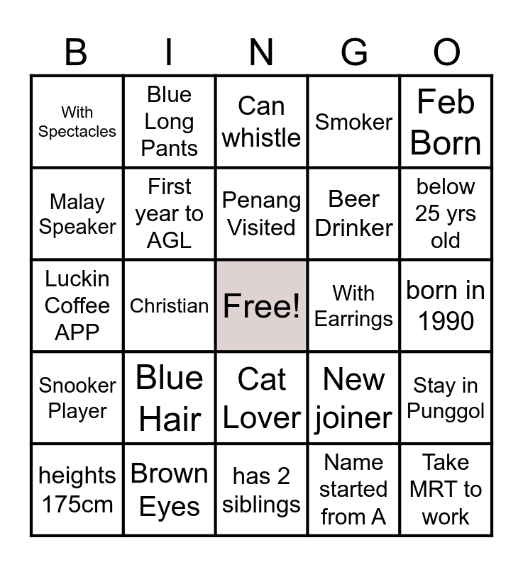 This bingo card has a free space and 24 words: Blue Hair, Brown Eyes, Penang Visited, heights 175cm, Feb Born, With Spectacles, Malay Speaker, Blue Long Pants, With Earrings, Cat Lover, Beer Drinker, Luckin Coffee APP, New joiner, Stay in Punggol, First year to AGL, Name started from A, born in 1990, Can whistle, below 25 yrs old, Christian, Take MRT to work, Snooker Player, Smoker and has 2 siblings.