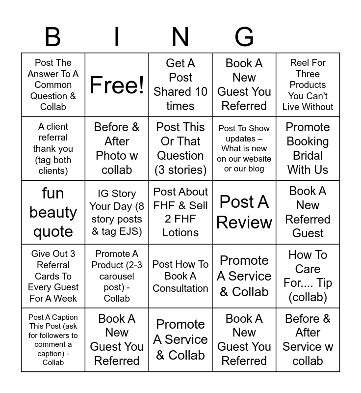 This bingo card has 25 words: Promote A Product (2-3 carousel post) - Collab, Promote A Service & Collab, Post This Or That Question (3 stories), Post A Caption This Post (ask for followers to comment a caption) - Collab, Reel For Three Products You Can't Live Without, Post The Answer To A Common Question & Collab, A client referral thank you (tag both clients), Free!, Post A Review, Post How To Book A Consultation, Post To Show updates – What is new on our website or our blog, fun beauty quote, Promote A Service & Collab, How To Care For.... Tip (collab), Before & After Photo w collab, Before & After Service w collab, Book A New Referred Guest, Get A Post Shared 10 times, Promote Booking Bridal With Us, IG Story Your Day (8 story posts & tag EJS), Post About FHF & Sell 2 FHF Lotions, Book A New Guest You Referred, Give Out 3 Referral Cards To Every Guest For A Week, Book A New Guest You Referred and Book A New Guest You Referred.