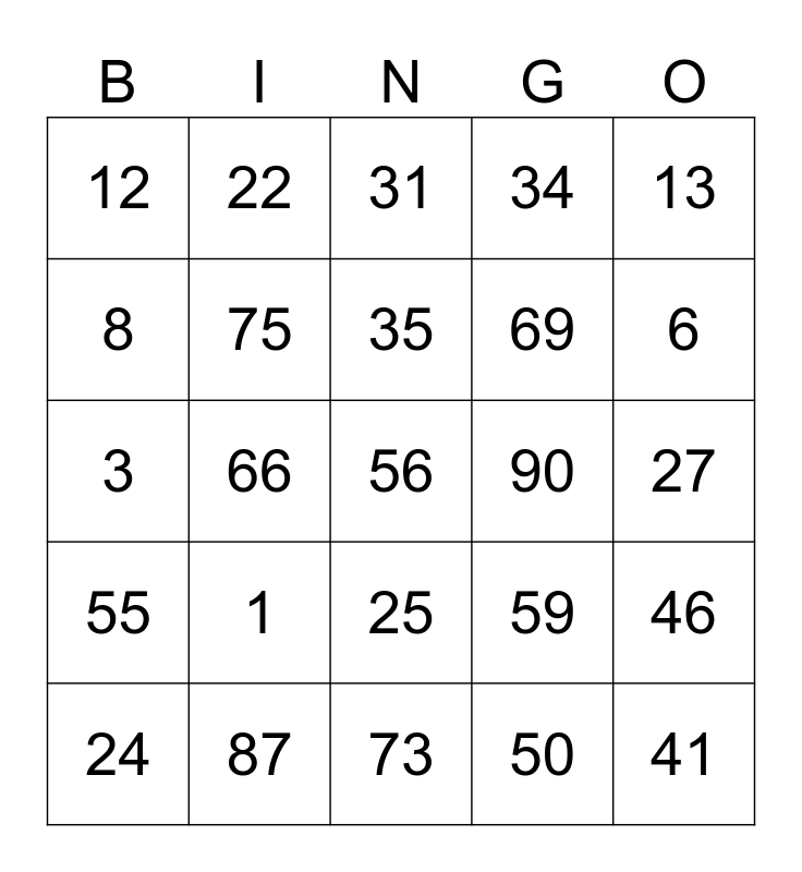 This bingo card has a free space and 24 words: 1, 87, 35, 24, 13, 12, 8, 22, 90, 25, 69, 3, 59, 46, 75, 50, 27, 31, 6, 66, 41, 55, 34 and 73.