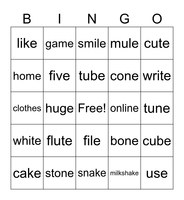 This bingo card has a free space and 37 words: name, slope, nine, five, cube, flute, tube, June, cute, rule, huge, mule, use, tune, home, white, size, smile, file, online, like, write, cake, snake, late, milkshake, game, bake, take, same, close, stone, clothes, toes, bone, cone and wrote.