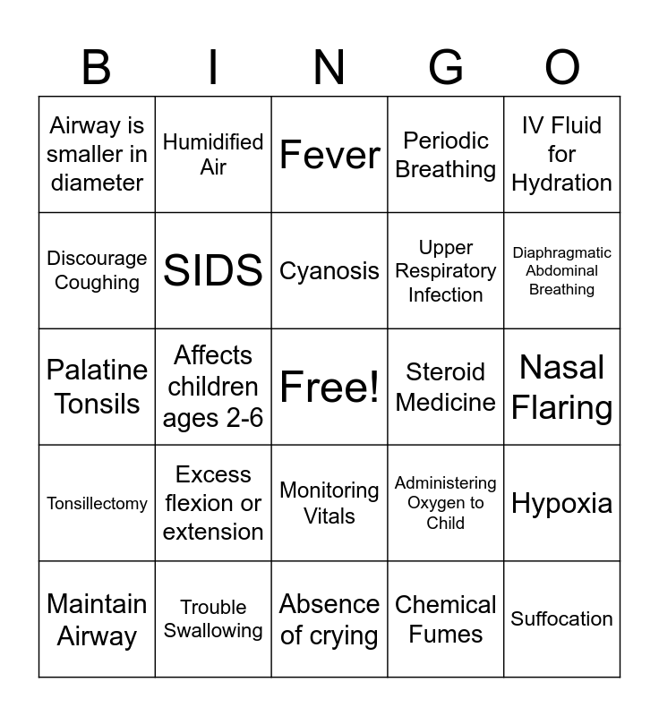 This bingo card has a free space and 39 words: Clear Liquids, Drainage of Blood, Secondhand Smoke, SIDS, Maintain Airway, Monitoring Vitals, Cyanosis, Carbon Dioxide, IV Fluid for Hydration, Tonsillectomy, Affects children ages 2-6, Periodic Breathing, Suffocation, Nasal Flaring, Steroid Medicine, Excess flexion or extension, Monitor Oxygen Saturation, Airway is smaller in diameter, Smoke inhalation, Administering Oxygen to Child, Discourage Coughing, Absence of crying, Upper Respiratory Infection, Diaphragmatic Abdominal Breathing, Nose Breathers, Respiratory Obstruction, Less Alveoli in the Lungs, Grunting, Wheezing, Humidified Air, Croup, Epiglottitis, Fever, Trouble Swallowing, Chemical Fumes, Carbon Monoxide Poisoning, Hypoxia, Palatine Tonsils and Respiratory Distress.