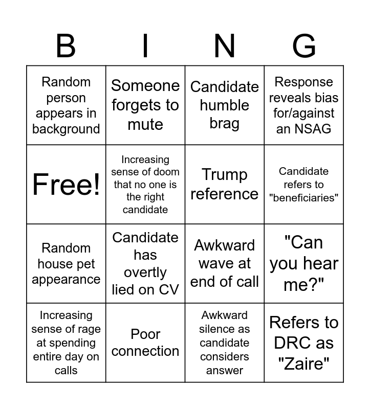This bingo card has 16 words: Poor connection, "Can you hear me?", Candidate humble brag, Random person appears in background, Random house pet appearance, Someone forgets to mute, Awkward wave at end of call, Awkward silence as candidate considers answer, Free!, Increasing sense of doom that no one is the right candidate, Increasing sense of rage at spending entire day on calls, Response reveals bias for/against an NSAG, Candidate has overtly lied on CV, Candidate refers to "beneficiaries", Trump reference and Refers to DRC as "Zaire".