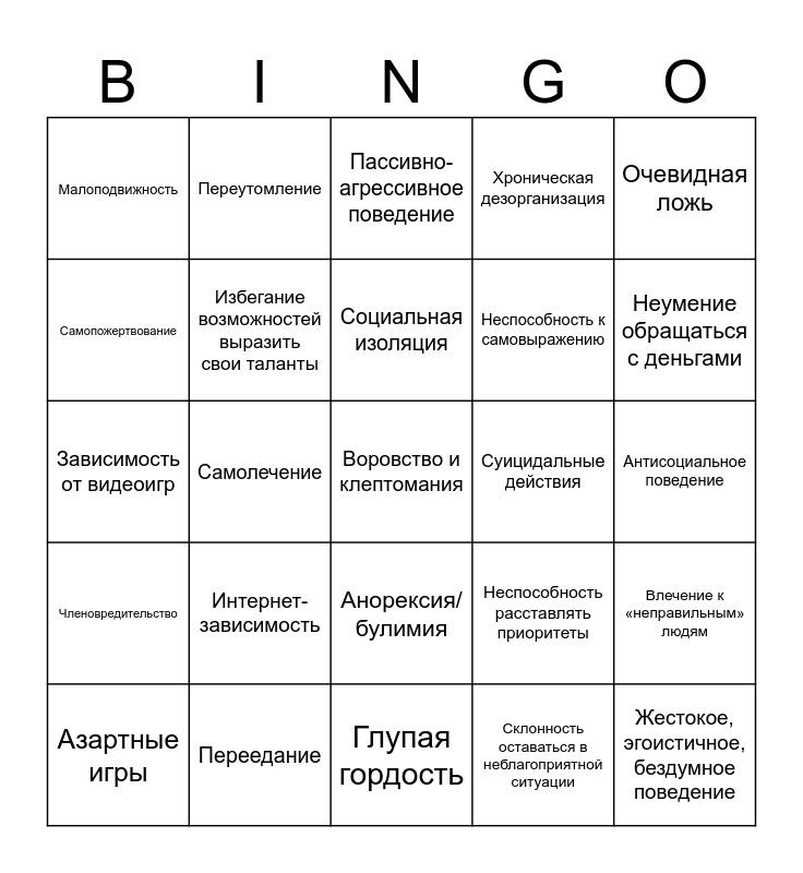 This bingo card has a free space and 24 words: Интернет-зависимость, Переедание, Социальная изоляция, Азартные игры, Очевидная ложь, Малоподвижность, Самопожертвование, Переутомление, Суицидальные действия, Анорексия/булимия, Неспособность к самовыражению, Зависимость от видеоигр, Неспособность расставлять приоритеты, Влечение к «неправильным» людям, Избегание возможностей выразить свои таланты, Склонность оставаться в неблагоприятной ситуации, Антисоциальное поведение, Пассивно-агрессивное поведение, Неумение обращаться с деньгами, Самолечение, Жестокое, эгоистичное, бездумное поведение, Членовредительство, Хроническая дезорганизация and Глупая гордость.