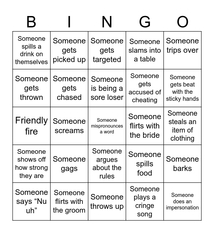 This bingo card has 25 words: Someone gags, Someone throws up, Someone is being a sore loser, Someone says “Nu uh”, Someone trips over, Someone spills a drink on themselves, Someone gets thrown, Someone gets picked up, Someone flirts with the bride, Someone argues about the rules, Someone gets accused of cheating, Friendly fire, Someone spills food, Someone barks, Someone gets chased, Someone does an impersonation, Someone steals an item of clothing, Someone gets targeted, Someone gets beat with the sticky hands, Someone screams, Someone mispronounces a word, Someone flirts with the groom, Someone shows off how strong they are, Someone slams into a table and Someone plays a cringe song.