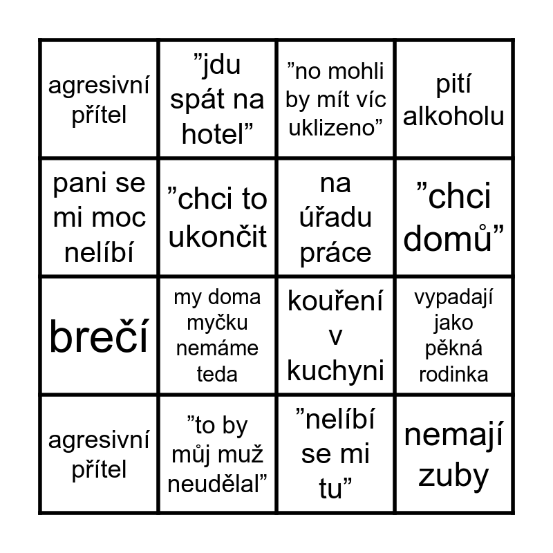 This bingo card has 23 words: ”stýská se mi”, “uklízíme každý den”, kouření v kuchyni, nemají zuby, brečí, ”jdu spát na hotel”, ”no mohli by mít víc uklizeno”, pití alkoholu, agresivní přítel, ”to by můj muž neudělal”, ”nelíbí se mi tu”, ”chci domů”, ”hádáme se hodně”, ”můj muž je pedant na úklid”, vytetovaný obočí, víc jak 3 děti, agresivní přítel, ”chci to ukončit, na úřadu práce, vypadají jako pěkná rodinka, pani se mi moc nelíbí, my doma myčku nemáme teda and u nás doma to chodí jinak.