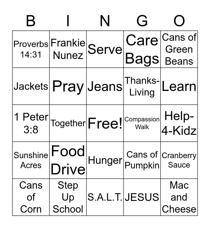 This bingo card has a free space and 24 words: Food Drive, Step Up School, Jeans, Cans of Corn, Cans of Green Beans, Proverbs 14:31, Jackets, Frankie Nunez, Compassion Walk, Hunger, Thanks- Living, 1 Peter 3:8, Cans of Pumpkin, Cranberry Sauce, Pray, JESUS, Help-4-Kidz, Serve, Learn, Together, Mac and Cheese, Sunshine Acres, Care Bags and S.A.L.T..