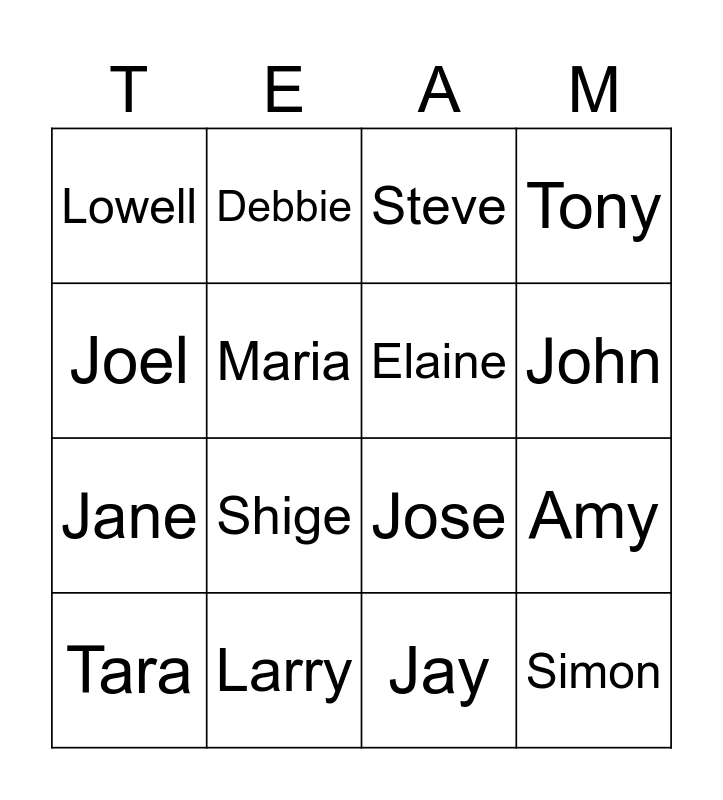This bingo card has 20 words: Amy, Stephen, Steve, Eva, Tara, Joel, Larry, Lowell, Jane, Debbie, Shige, Jose, Maria, Simon, Elaine, Charlie, John, Tony, Jay and Kevin.