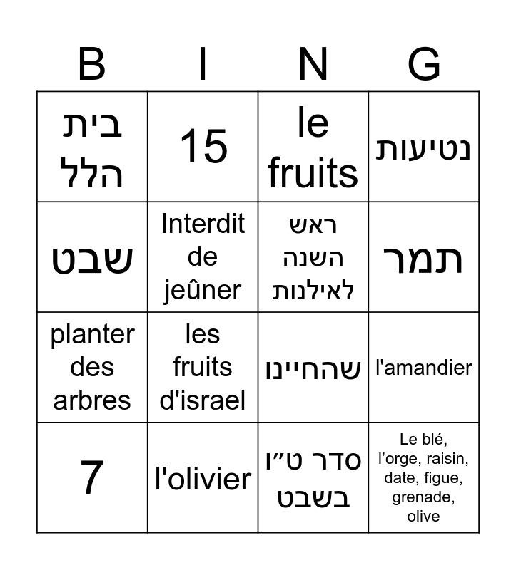 This bingo card has 20 words: l'amandier, la banane, le fruits, le KKL, 7, שבט, l'olivier, בית הלל, planter des arbres, 15, les fruits d'israel, שהחיינו, Interdit de jeûner, Le blé, l’orge, raisin, date, figue, grenade, olive, ראש השנה לאילנות, אילן, תמר, נטיעות, סדר ט״ו בשבט and תרומה.