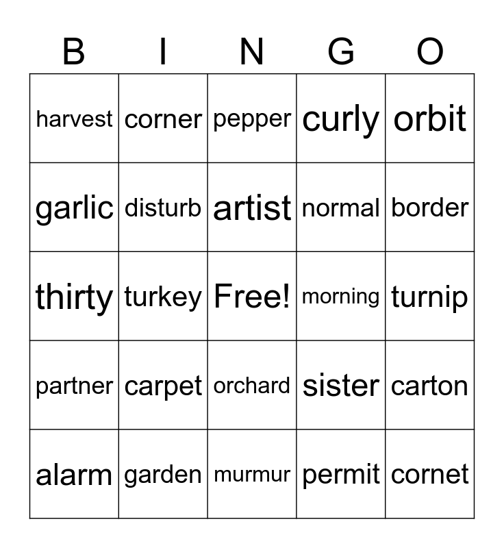 This bingo card has a free space and 24 words: carpet, garden, artist, alarm, orbit, harvest, garlic, corner, morning, orchard, normal, thirty, sister, carton, disturb, permit, turnip, pepper, border, turkey, cornet, partner, curly and murmur.