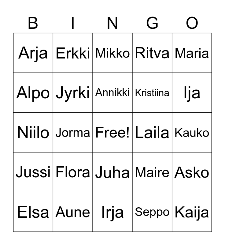 This bingo card has a free space and 47 words: Pertti, Kaija, Ritva-Leena, Irja, Flora, Virmo, Erkki, Raila, Alpo, Veikko, Jyrki, Ritva, Asko, Maire, Eeva, Liisa, Annikki, Laila, Hilppa-Liisa, Maria, Jorma, Seppo, Arja, Kristiina, Ester, Ija, Elsa, Sessa, Juha, Jussi, Taina, Sinikka, Pentti, Pirkko, Pekka, Aune, Kauko, Hilkka, Leena, Jaakko, Riitta, Mikko, Niilo, Laura, Saara, Soili and Ahti.