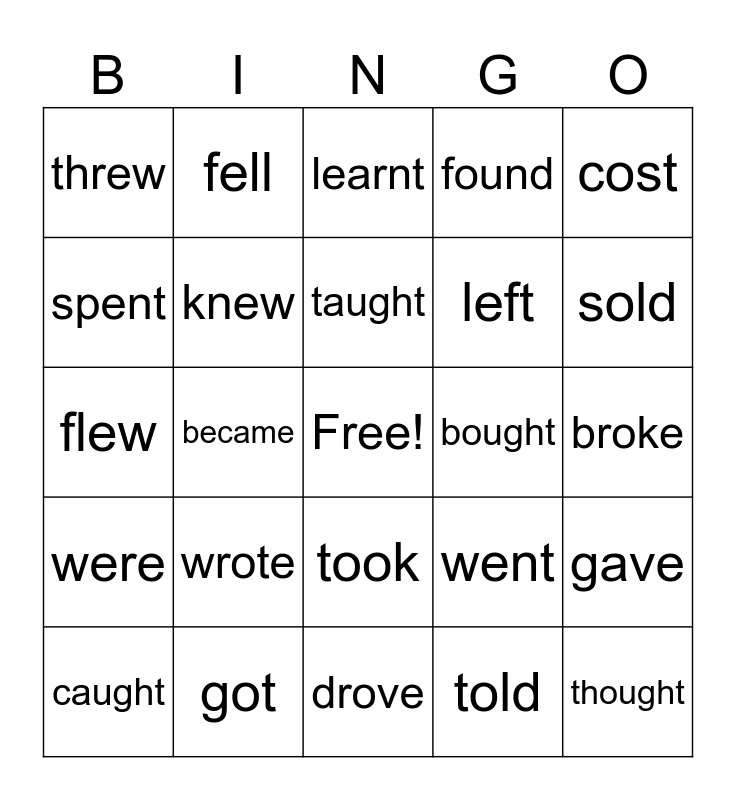 This bingo card has a free space and 24 words: wrote, got, taught, caught, cost, threw, spent, fell, bought, took, left, flew, went, gave, knew, told, broke, learnt, sold, became, thought, were, found and drove.