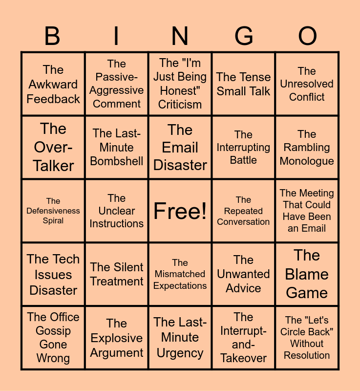 This bingo card has a free space and 24 words: The Silent Treatment, The Explosive Argument, The Email Disaster, The Office Gossip Gone Wrong, The Unresolved Conflict, The Awkward Feedback, The Over-Talker, The Passive-Aggressive Comment, The Repeated Conversation, The Mismatched Expectations, The Interrupting Battle, The Defensiveness Spiral, The Unwanted Advice, The Blame Game, The Last-Minute Bombshell, The Interrupt-and-Takeover, The Meeting That Could Have Been an Email, The "I'm Just Being Honest" Criticism, The Rambling Monologue, The Unclear Instructions, The "Let's Circle Back" Without Resolution, The Tech Issues Disaster, The Tense Small Talk and The Last-Minute Urgency.