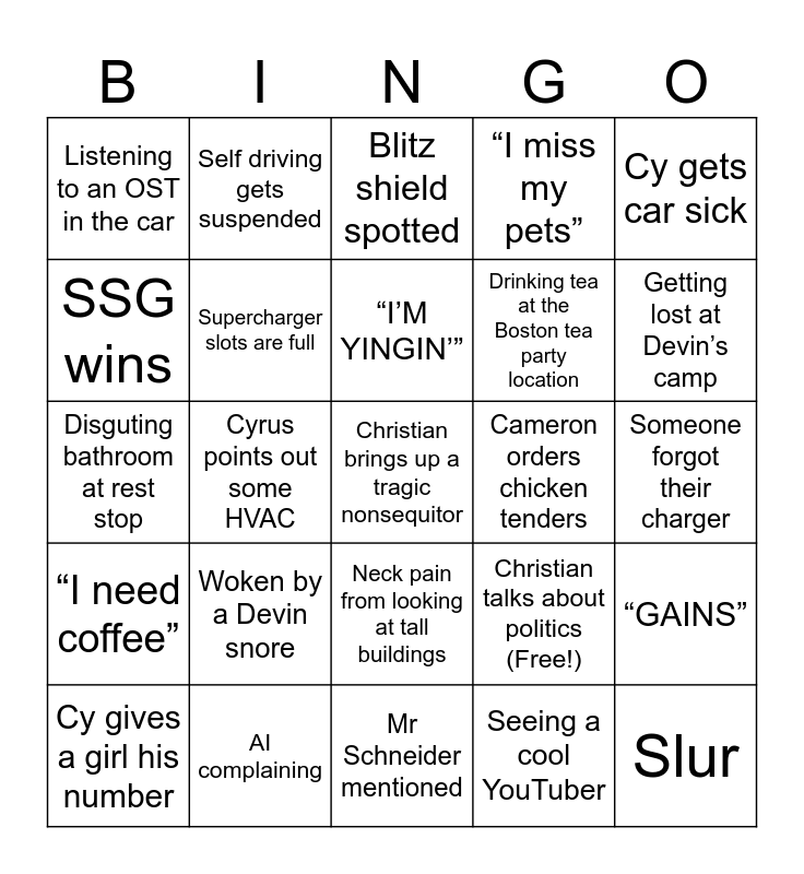 This bingo card has 25 words: Woken by a Devin snore, Mr Schneider mentioned, “I’M YINGIN’”, Cy gives a girl his number, Cy gets car sick, Listening to an OST in the car, SSG wins, Self driving gets suspended, Cameron orders chicken tenders, Neck pain from looking at tall buildings, Drinking tea at the Boston tea party location, Disguting bathroom at rest stop, Christian talks about politics (Free!), “GAINS”, Supercharger slots are full, Slur, Someone forgot their charger, Blitz shield spotted, Getting lost at Devin’s camp, Cyrus points out some HVAC, Christian brings up a tragic nonsequitor, AI complaining, “I need coffee”, “I miss my pets” and Seeing a cool YouTuber.
