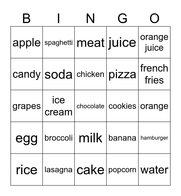 This bingo card has 30 words: rice, lettuce, chicken, pasta, orange juice, apple, spaghetti, milk, cookies, water, egg, soda, beans, popcorn, hamburger, hot dog, ice cream, chocolate, banana, french fries, grapes, lasagna, meat, pizza, orange, candy, broccoli, cake, juice and bread.