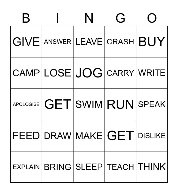 This bingo card has 30 words: BRING, DRINK, GET, GO, GIVE, LEAVE, LOSE, MAKE, RUN, SLEEP, SPEAK, SWIM, TEACH, THINK, WRITE, FORGET, GET, FEED, DRAW, BUY, APOLOGISE, ARGUE, ANSWER, CARRY, CAMP, CRASH, DISLIKE, EXPLAIN, JOG and IGNORE.