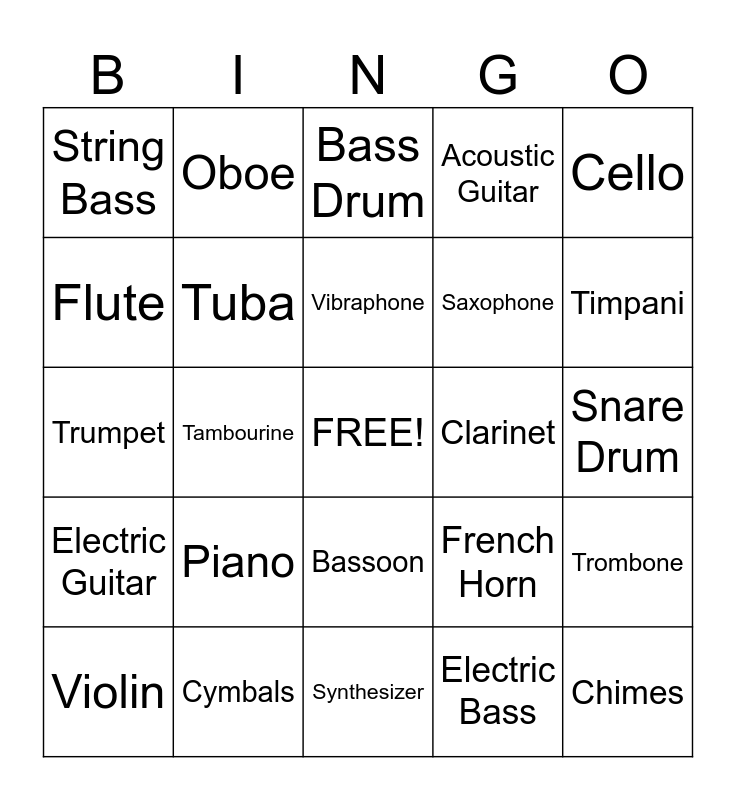 This bingo card has a free space and 25 words: Piano, Synthesizer, Vibraphone, Violin, Cello, String Bass, Flute, Oboe, Clarinet, Bassoon, Saxophone, Trumpet, French Horn, Trombone, Tuba, Triangle, Snare Drum, Bass Drum, Timpani, Tambourine, Chimes, Cymbals, Electric Guitar, Acoustic Guitar and Electric Bass.