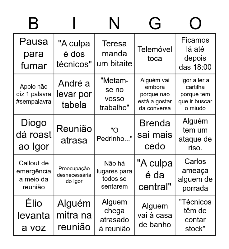 This bingo card has a free space and 24 words: Élio levanta a voz, Preocupação desnecessária do Igor, "Metam-se no vosso trabalho", Alguem vai à casa de banho, Ficamos lá até depois das 18:00, Pausa para fumar, "A culpa é dos técnicos", Teresa manda um bitaite, Brenda sai mais cedo, Alguém tem um ataque de riso., Diogo dá roast ao Igor, André a levar por tabela, "A culpa é da central", Carlos ameaça alguem de porrada, Apolo não diz 1 palavra #sempalavra, Alguém mitra na reunião, Alguem chega atrasado à reunião, Telemóvel toca, Igor a ler a cartilha porque tem que ir buscar o miudo, Callout de emergência a meio da reunião, Reunião atrasa, Não há lugares para todos se sentarem, Alguém vai embora porque nao está a gostar da conversa and "Técnicos têm de contar stock".