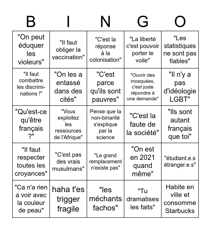 This bingo card has 25 words: "C'est pas des vrais musulmans", "les méchants fachos", "C'est parce qu'ils sont pauvres", "Ca n'a rien a voir avec la couleur de peau", "Les statistiques ne sont pas fiables", "On peut éduquer les violeurs", "Il faut combattre les discrimi-nations !", "Il faut obliger la vaccination", "C'est la faute de la société", "Le grand remplacement n'existe pas", "Ouvrir des mosquées, c'est juste répondre à une demande", "Qu'est-ce qu'être français ?", "On est en 2021 quand même", "étudiant.e.s étranger.e.s", "On les a entassé dans des cités", Habite en ville et consomme Starbucks, "Ils sont autant français que toi", "C'est la réponse à la colonisation", "Il n'y a pas d'idéologie LGBT", "Vous exploitez les ressources de l'Afrique", Pense que la non-binarité s'explique par la science, haha t'es trigger fragile, "Il faut respecter toutes les croyances", "La liberté c'est pouvoir porter le voile" and "Tu dramatises les faits".