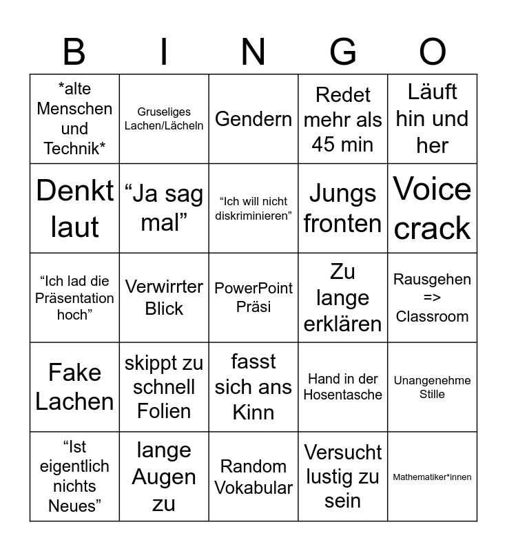 This bingo card has a free space and 24 words: skippt zu schnell Folien, lange Augen zu, “Ich will nicht diskriminieren”, “Ist eigentlich nichts Neues”, Läuft hin und her, *alte Menschen und Technik*, Denkt laut, Gruseliges Lachen/Lächeln, Zu lange erklären, fasst sich ans Kinn, Jungs fronten, “Ich lad die Präsentation hoch”, Hand in der Hosentasche, Unangenehme Stille, “Ja sag mal”, Versucht lustig zu sein, Rausgehen => Classroom, Gendern, Voice crack, Verwirrter Blick, Mathematiker*innen, Fake Lachen, Redet mehr als 45 min and Random Vokabular.