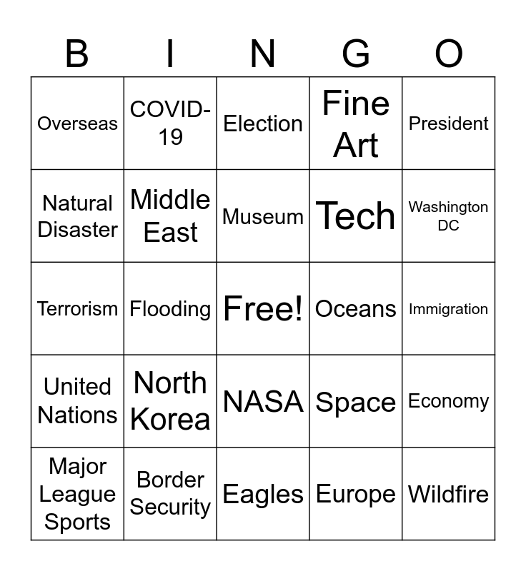 This bingo card has a free space and 24 words: North Korea, Border Security, Museum, Major League Sports, President, Overseas, Natural Disaster, COVID-19, Oceans, NASA, Tech, Terrorism, Space, Economy, Middle East, Europe, Immigration, Election, Washington DC, Flooding, Wildfire, United Nations, Fine Art and Eagles.