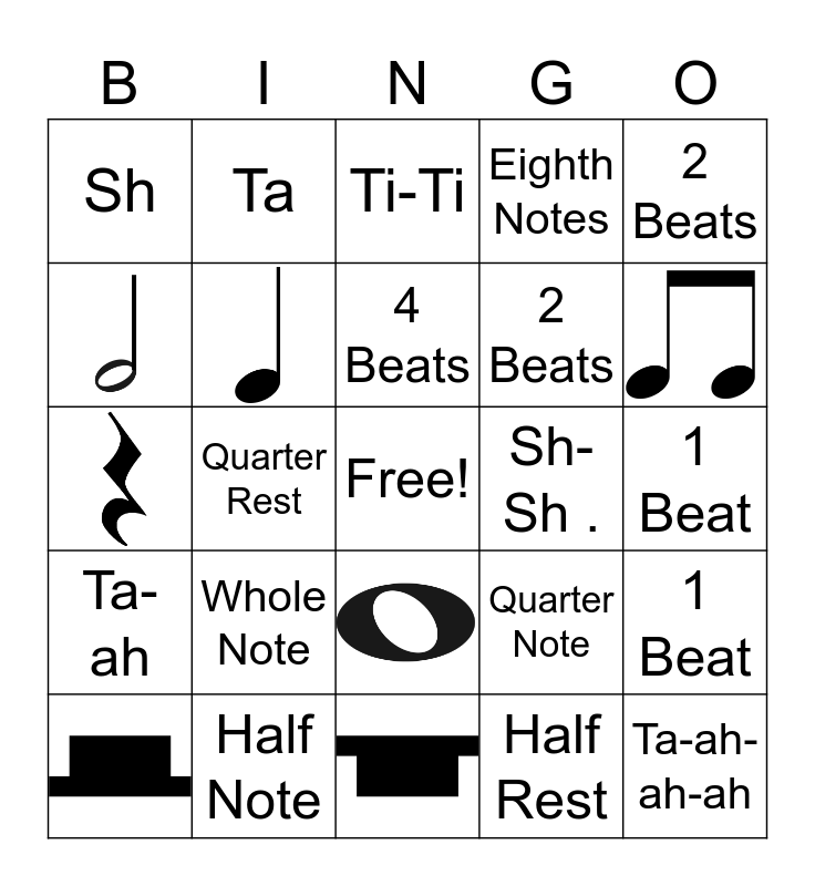 This bingo card has 7 images, a free space and 17 words: Whole Note, Half Note, 4 Beats, 2 Beats, Sh, Ta, Sh-Sh ., 2 Beats, Quarter Note, 1 Beat, Half Rest, 1 Beat, Ti-Ti, Quarter Rest, Ta-ah-ah-ah, Ta-ah and Eighth Notes.