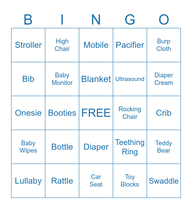 This bingo card has a free space and 24 words: Bottle, Rattle, Blanket, Lullaby, Burp Cloth, Stroller, Bib, High Chair, Rocking Chair, Diaper, Ultrasound, Onesie, Teething Ring, Teddy Bear, Baby Monitor, Toy Blocks, Crib, Mobile, Diaper Cream, Booties, Swaddle, Baby Wipes, Pacifier and Car Seat.