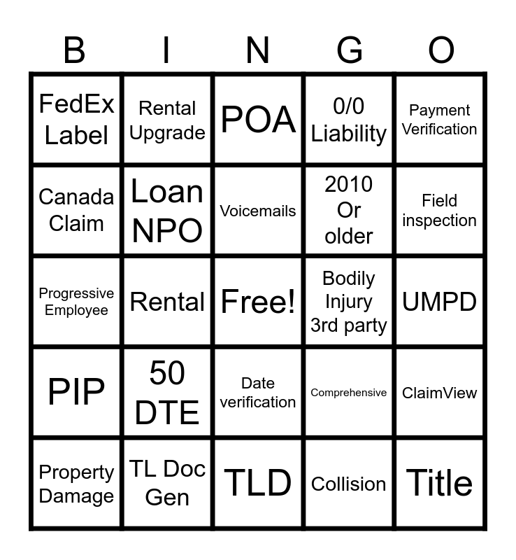 This bingo card has a free space and 29 words: Property Damage, Heirship of Affidavit, Rental, UM/UIM, FedEx Label, POA, Loan NPO, 50 DTE, Bodily Injury 3rd party, TL Doc Gen, UMPD, Title, TLD, Collision, Field inspection, Bodily Injury 1st Party, Date verification, PIP, Payment Verification, Progressive Employee, Comprehensive, Tow Bill, 2010 Or older, Canada Claim, 0/0 Liability, Rental Upgrade, ClaimView, Voicemails and Action Items.