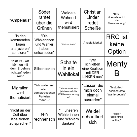 This bingo card has 25 words: "Wir wollen mit allen demokratischen Parteien reden...", "... unseren Wählerinnen und Wählern danken", "Linksrutsch", "nicht an der Zeit über Koalitionen zu sprechen", "Dafür übernehme ich die Verantwortung", "Ampelaus", "in den kommenden Tagen analysieren/ sondieren", Söder rantet über die Grünen, "Wir schließen eine Koalition mit DER LINKEN aus", "Schauen wir uns jetzt einmal die Wählerwanderung an", Angela Merkel, "Klar ist - wir können mit dem Ergebnis nicht zufrieden sein", "Lassen Sie mich doch einmal ausreden", "historisch schlechteste Wahlergebnis", "Die Wählerinnen und Wähler haben entschieden", "klarer Regierungs-auftrag", Menty B, Weidels Wohnort wird thematisiert, RRG ist keine Option, Silberlocken, Schalte in ein Wahllokal, rein rechnerisch, Migration wird thematisiert, Christian Linder redet Scheiße and Weidel echauffiert sich.