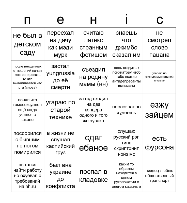 This bingo card has 25 words: в жизни не слушал каспийский груз, поспал в кладовке, съездил на родину мамы (нн), пытался найти работу но охуевал с требований на hh.ru, не смотрел слово пацана, не был в детском саду, после неудачных отношений начал контролировать то что вываливается изо рта (слова), переехал на дачу как мэди мурк, неосознанно худеешь, сдвг ебаное, лень сходить к психиатору чтоб тебе всякие антидепресанты выписали, понял что гомосексуален ещё когда учился в школе, слушаю русский рэп типа скриптонит нойз мс, есть фурсона, застал yungrussia до её смерти, пиздец люблю общественный транспорт, езжу зайцем, считаю латекс странным фетишем, угараю по экспериментальной музыке, угараю по старой технике, за год сходил на два концера одного и того же чувака, был вна украине до конфликта, поссорился с бывшим но потом помирился, знаешь что джимбо сказал им and каким то образом находится в одном рукопожатии с олегом кашиным.