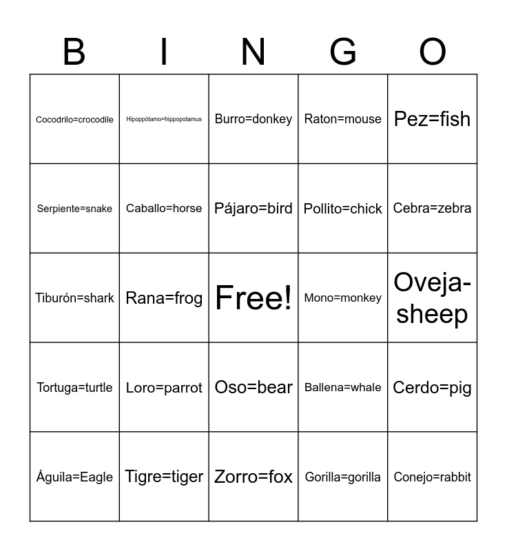 This bingo card has a free space and 38 words: Vaca=cow, Perro=dog, Gato=cat, Caballo=horse, Cerdo=pig, Loro=parrot, Pájaro=bird, Pato=duck, Pez=fish, Pollito=chick, Rana=frog, Raton=mouse, Conejo=rabbit, Oveja-sheep, Serpiente=snake, Tortuga=turtle, Cabra-goat, Burro=donkey, León=lion, Mono=monkey, Cocodrilo=crocodile, Tigre=tiger, Cebra=zebra, Águila=Eagle, Murcielago=bat, Zorro=fox, Camello=camel, Rinoceronte=rhinoceros, Jirafa=giraffe, Elefante=elephant, Ciervo/reno=deer, Oso=bear, Gorilla=gorilla, Hipoppótamo=hippopotamus, Delfín=dolphin, Ballena=whale, Tiburón=shark and Pinguino=penguin.