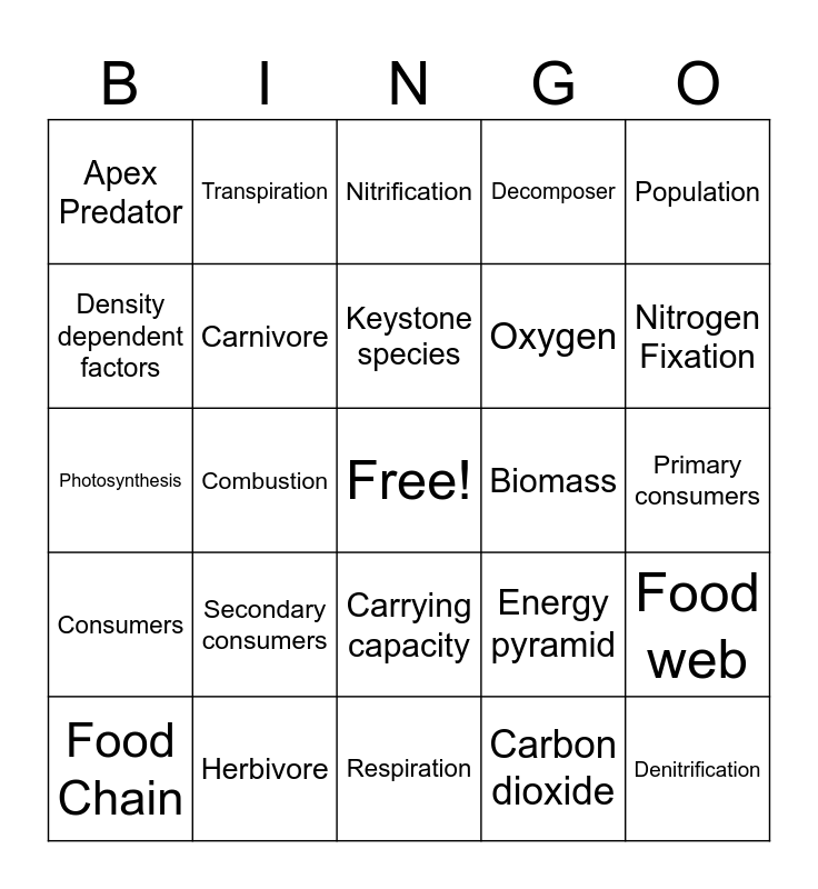 This bingo card has a free space and 35 words: 10%, Autotrophs, Biodiversity, Carnivore, Carrying capacity, Decomposer, Density dependent factors, Density independent factors, Keystone species, Limiting factors, Photosynthesis, Population, Sunlight, Trophic level, Apex Predator, Biomass, Carbon dioxide, Combustion, Consumers, Denitrification, Energy pyramid, Food Chain, Food web, Herbivore, Nitrification, Nitrogen Fixation, Nitrogen fixing Bacteria, Omnivore, Oxygen, Primary consumers, Producer, Respiration, Secondary consumers, Transpiration and Weathering.