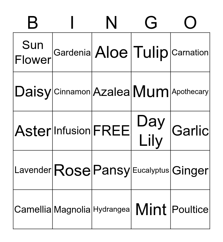 This bingo card has a free space and 24 words: Rose, Magnolia, Azalea, Camellia, Carnation, Sun Flower, Daisy, Gardenia, Day Lily, Pansy, Mum, Aster, Eucalyptus, Ginger, Cinnamon, Mint, Garlic, Aloe, Apothecary, Infusion, Poultice, Lavender, Tulip and Hydrangea.