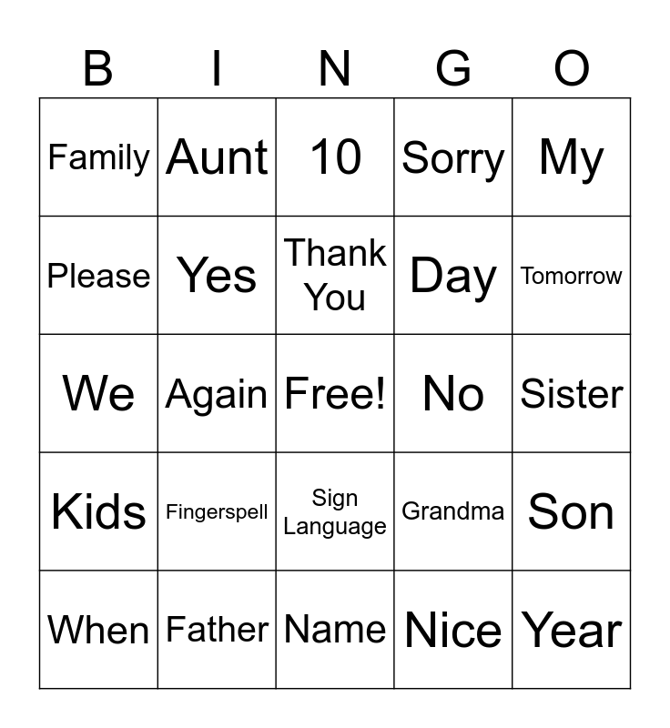 This bingo card has a free space and 24 words: Fingerspell, Father, Thank You, When, My, Family, Please, Aunt, No, Sign Language, Day, We, Grandma, Son, Yes, Nice, Sister, 10, Tomorrow, Again, Year, Kids, Sorry and Name.