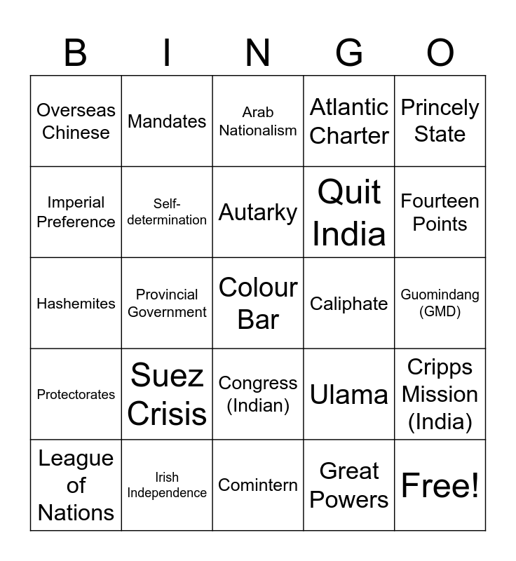 This bingo card has 34 words: Free!, Great Powers, Decolonization, Dominion, Protectorates, Self-determination, Princely State, League of Nations, Mandates, Khilafat Movement, Autarky, Arab Nationalism, Pan-Arabism, Young Turks, Caliphate, Fourteen Points, Irish Independence, Hashemites, Suez Crisis, Ulama, Congress (Indian), Import Substitution, Overseas Chinese, Guomindang (GMD), Comintern, Colour Bar, Atlantic Charter, Free French Forces, Quit India, Imperial Preference, Copper-Belt Strike, Provincial Government, Cripps Mission (India) and Irish Republic.