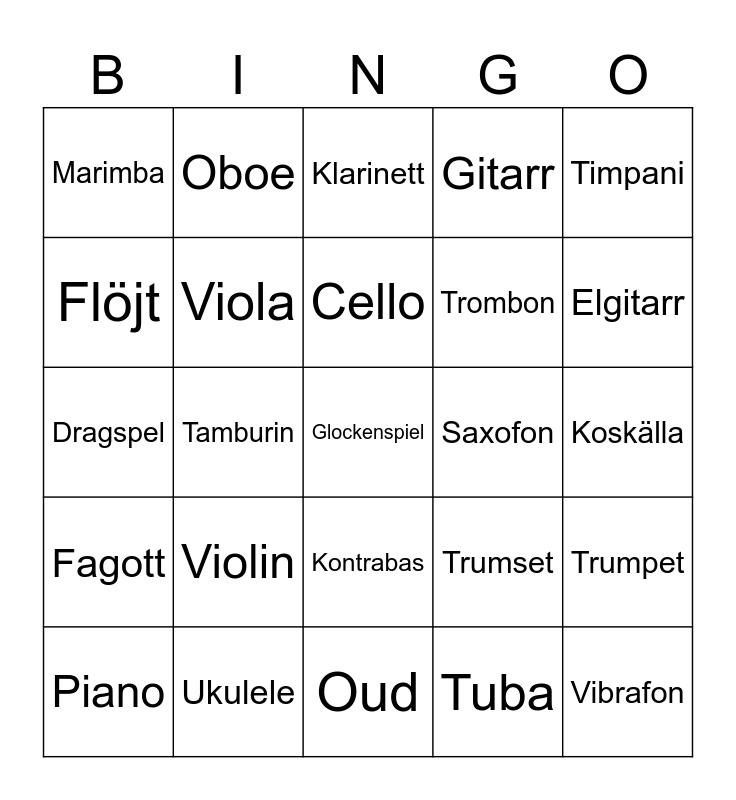 This bingo card has 28 words: Trumpet, Horn, Trombon, Tuba, Flöjt, Klarinett, Oboe, Fagott, Saxofon, Piano, Dragspel, Gitarr, Ukulele, Oud, Elgitarr, Elbas, Violin, Viola, Cello, Kontrabas, Marimba, Vibrafon, Glockenspiel, Tamburin, Koskälla, Trumset, Timpani and Cymbal.
