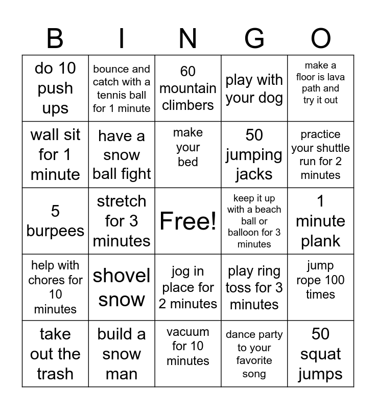 This bingo card has a free space and 24 words: shovel snow, build a snow man, make your bed, take out the trash, make a floor is lava path and try it out, do 10 push ups, wall sit for 1 minute, bounce and catch with a tennis ball for 1 minute, keep it up with a beach ball or balloon for 3 minutes, jog in place for 2 minutes, 50 jumping jacks, 5 burpees, play ring toss for 3 minutes, jump rope 100 times, have a snow ball fight, dance party to your favorite song, 1 minute plank, 60 mountain climbers, practice your shuttle run for 2 minutes, stretch for 3 minutes, 50 squat jumps, help with chores for 10 minutes, play with your dog and vacuum for 10 minutes.