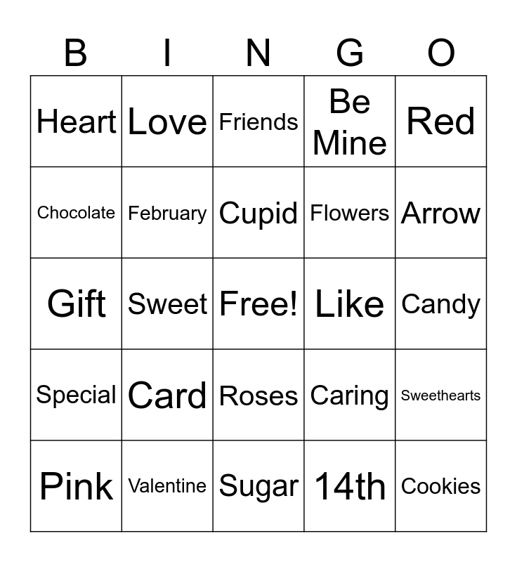 This bingo card has a free space and 24 words: Card, Valentine, Cupid, Pink, Red, Heart, Chocolate, Love, Like, Roses, Flowers, Gift, Caring, Sweethearts, February, 14th, Candy, Friends, Arrow, Sweet, Cookies, Special, Be Mine and Sugar.