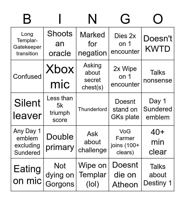 This bingo card has a free space and 24 words: Double primary, Not dying on Gorgons, Asking about secret chest(s), Eating on mic, Doesn't KWTD, Long Templar-Gatekeeper transition, Confused, Shoots an oracle, Doesnt stand on GKs plate, Ask about challenge, 2x Wipe on 1 encounter, Silent leaver, VoG Farmer joins (100+ clears), 40+ min clear, Xbox mic, Doesnt die on Atheon, Day 1 Sundered emblem, Marked for negation, Talks nonsense, Less than 5k triumph score, Talks about Destiny 1, Any Day 1 emblem excluding Sundered, Dies 2x on 1 encounter and Wipe on Templar (lol).
