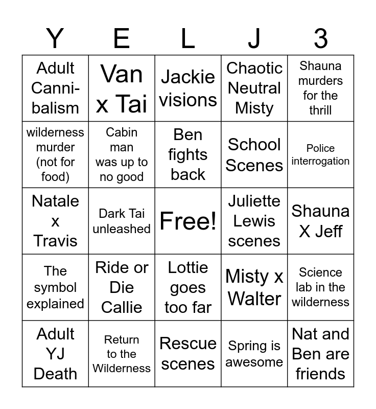 This bingo card has a free space and 24 words: Ride or Die Callie, Return to the Wilderness, Ben fights back, Adult YJ Death, Shauna murders for the thrill, Adult Canni-balism, wilderness murder (not for food), Van x Tai, Juliette Lewis scenes, Lottie goes too far, School Scenes, Natale x Travis, Misty x Walter, Science lab in the wilderness, Cabin man was up to no good, Spring is awesome, Shauna X Jeff, Jackie visions, Police interrogation, Dark Tai unleashed, Nat and Ben are friends, The symbol explained, Chaotic Neutral Misty and Rescue scenes.