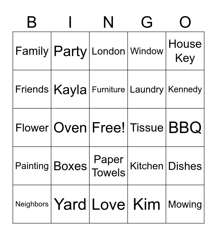This bingo card has a free space and 24 words: Boxes, Yard, Furniture, Neighbors, House Key, Family, Friends, Party, Tissue, Paper Towels, Laundry, Flower, Kitchen, Dishes, Kayla, Kim, BBQ, London, Kennedy, Oven, Mowing, Painting, Window and Love.