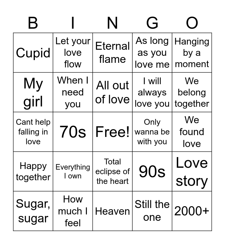 This bingo card has a free space and 40 words: 60s, 70s, 80s, 90s, 2000+, Cant help falling in love, When I need you, Endless love, I will always love you, Love story, Cupid, Let your love flow, Heaven, Still the one, We found love, My girl, Three times a lady, Eternal flame, My heart will go on, Hanging by a moment, Happy together, How much I feel, All out of love, Only wanna be with you, Love, The look of love, How deep is your love, Keep on loving you, All my life, If I ain't got you, Unchained melody, Everything I own, Total eclipse of the heart, I don't want to miss a thing, We belong together, Sugar, sugar, Just the way you are, Up where we belong, As long as you love me and I don't care.
