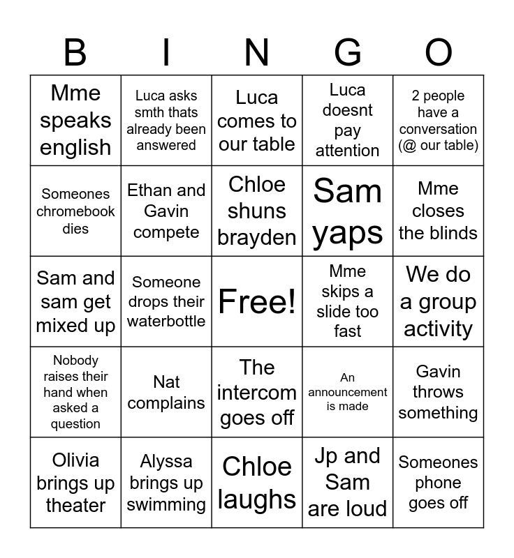 This bingo card has a free space and 24 words: Nat complains, Alyssa brings up swimming, Chloe shuns brayden, Olivia brings up theater, 2 people have a conversation (@ our table), Mme speaks english, Someones chromebook dies, Luca asks smth thats already been answered, Mme skips a slide too fast, The intercom goes off, Sam yaps, Sam and sam get mixed up, An announcement is made, Gavin throws something, Ethan and Gavin compete, Jp and Sam are loud, We do a group activity, Luca comes to our table, Mme closes the blinds, Someone drops their waterbottle, Someones phone goes off, Nobody raises their hand when asked a question, Luca doesnt pay attention and Chloe laughs.