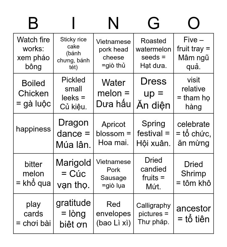 This bingo card has 50 words: Peach blossom = Hoa đào., Apricot blossom = Hoa mai., Kumquat tree = Cây quất., Red envelopes (bao Lì xì), Marigold = Cúc vạn thọ., Lantern (Đèn lồng), Sticky rice cake (bánh chưng, bánh tét), The New Year tree = Cây nêu., Boiled Chicken = gà luộc, Pickled onion = Dưa hành., Pickled small leeks = Củ kiệu., Roasted watermelon seeds = Hạt dưa., Dried Shrimp = tôm khô, Dried candied fruits = Mứt., Mung bean = Hạt đậu xanh, Fatty pork = Mỡ lợn, Water melon = Dưa hấu, Spring festival = Hội xuân., Family reunion = Cuộc đoàn tụ gia đình., Five – fruit tray = Mâm ngũ quả., Dragon dance = Múa lân., Calligraphy pictures = Thư pháp., Watch fire works: xem pháo bông, Dress up = Ăn diện, Sweep the floor = Quét nhà, ancestor = tổ tiên, visit relative = tham họ hàng, chinese sausage = lạp xưởng, Vietnamese pork head cheese =giò thủ, Vietnamese Pork Sausage =giò lụa, health, longevity =sự trường thọ, wealth =sự giàu có, prosperity = sự thinh vượng, gratitude = lòng biêt ơn, banana leaves, bamboo strings = dây lạc, lotus = hoa sen, tuberose = hoa huệ, celebrate = tổ chức, ăn mừng, red banner =câu đối đỏ, spring roll = nem rán, New year wishes = lời chúc năm mới, worship = thờ cúng, play cards = chơi bài, happiness, success, candied fruit = mứt tết, bitter melon = khổ qua and Tet flowers.