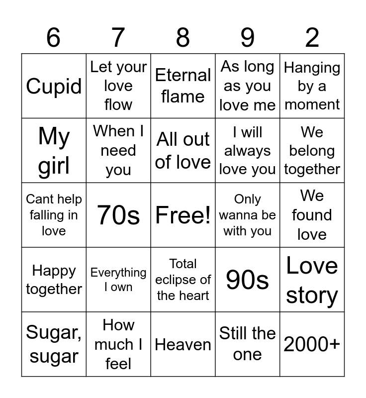This bingo card has a free space and 40 words: 60s, 70s, 80s, 90s, 2000+, Cant help falling in love, When I need you, Endless love, I will always love you, Love story, Cupid, Let your love flow, Heaven, Still the one, We found love, My girl, Three times a lady, Eternal flame, My heart will go on, Hanging by a moment, Happy together, How much I feel, All out of love, Only wanna be with you, Love, The look of love, How deep is your love, Keep on loving you, All my life, If I ain't got you, Unchained melody, Everything I own, Total eclipse of the heart, I don't want to miss a thing, We belong together, Sugar, sugar, Just the way you are, Up where we belong, As long as you love me and I don't care.