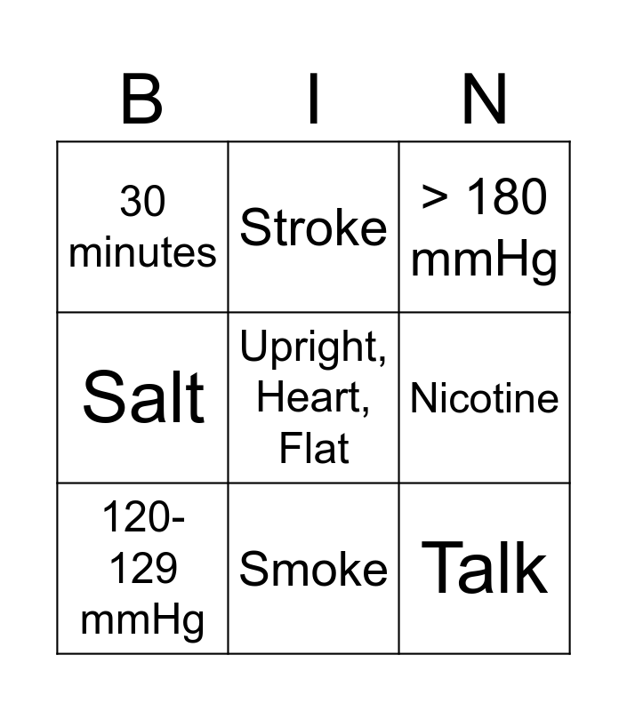 This bingo card has 9 words: 120-129 mmHg, > 180 mmHg, Stroke, Salt, 30 minutes, Nicotine, Upright, Heart, Flat, Talk and Smoke.