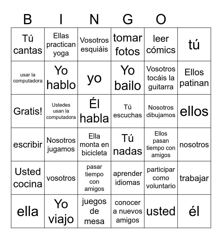 This bingo card has 36 words: aprender idiomas, pasar tiempo con amigos, conocer a nuevos amigos, usar la computadora, escribir, Tú escuchas, Yo hablo, juegos de mesa, leer cómics, participar como voluntario, Ellos patinan, tomar fotos, trabajar, Ustedes usan la computadora, Yo bailo, Tú cantas, Usted cocina, Nosotros dibujamos, Gratis!, Vosotros esquiáis, Él habla, Nosotros jugamos, Tú nadas, Ella monta en bicicleta, Ellos pasan tiempo con amigos, Ellas practican yoga, Vosotros tocáis la guitarra, Yo viajo, yo, tú, él, ella, nosotros, ellos, vosotros and usted.