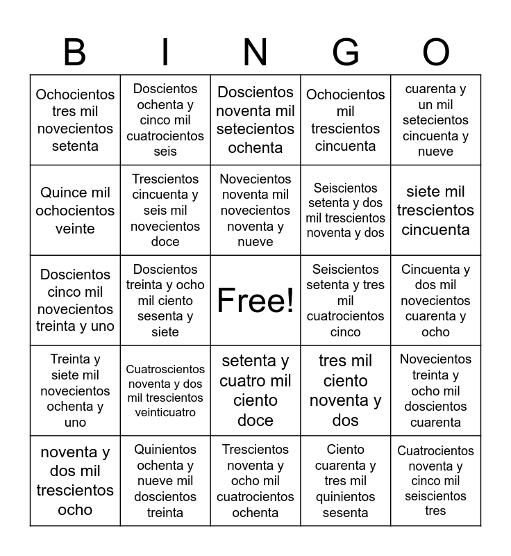 This bingo card has a free space and 40 words: Catorce mil trescientos cuarenta y dos, Doscientos cinco mil novecientos treinta y uno, Quince mil setecientos ochenta y cuatro, Trescientos cincuenta y seis mil novecientos doce, Quinientos ochenta y nueve mil doscientos treinta, setenta y cuatro mil ciento doce, Novecientos noventa mil novecientos noventa y nueve, Seiscientos cinco mil ochocientos cincuenta y tres, cuarenta y un mil setecientos cincuenta y nueve, Treinta y siete mil novecientos ochenta y uno, Doscientos treinta y ocho mil ciento sesenta y siete, Ochocientos mil trescientos cincuenta, Cuatrocientos noventa y cinco mil seiscientos tres, Cincuenta y dos mil novecientos cuarenta y ocho, Seiscientos setenta y tres mil cuatrocientos cinco, Cuatroscientos noventa y dos mil trescientos veinticuatro, Setenta y ocho mil doscientos ochenta y uno, Ochocientos tres mil novecientos setenta, diez mil cuatrocientos sesenta y cinco, Doscientos noventa mil setecientos ochenta, Novecientos treinta y ocho mil doscientos cuarenta, Ciento cuarenta y tres mil quinientos sesenta, Seiscientos setenta y dos mil trescientos noventa y dos, Quince mil ochocientos veinte, Cuatrocientos treinta mil quinientos treinta y cuatro, Quinientos sesenta mil setecientos ochenta y cinco, Novecientos tres mil ciento setenta y ocho, Doscientos cinco mil novecientos cincuenta y ocho, cuarenta y cinco mil setecientos treinta, Cuatrocientos veinte mil ochocientos tres, Seiscientos noventa y cinco mil cien, noventa y dos mil trescientos ocho, ocho mil ciento veintisiete, tres mil ciento noventa y dos, siete mil trescientos cincuenta, Trescientos noventa y ocho mil cuatrocientos ochenta, Cinco mil setecientos cuarenta y tres, Catorce mil cuatrocientos setenta, Doscientos ochenta y cinco mil cuatrocientos seis and Novecientos cuatro mil quinientos sesenta y dos.